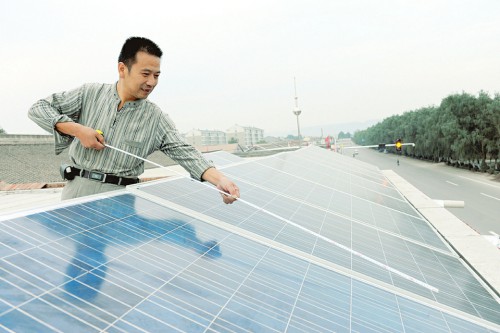 在澤州縣金村鎮(zhèn)府城村緊鄰陵沁一級公路邊的二層小樓上,12塊太陽能多晶板整齊地排放著。“每塊電池板長1.65米,寬約1米,通過板下的逆變器,把直流電變成交流電,再通過一根電線,我的‘發(fā)電站’發(fā)的電,就和國家電網(wǎng)連到一起了。”它的主人李國杰說,“每塊太陽能板250瓦,天氣好時,每天能發(fā)兩三度電。”