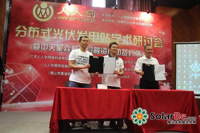 此次人人創(chuàng)股權(quán)投融資平臺聯(lián)合順德中山大學(xué)太陽能研究院,正是借助全國首個(gè)眾籌分布式光伏發(fā)電站項(xiàng)目——“中天星工廠式光伏發(fā)電站項(xiàng)目”融資成功的契機(jī),成功舉辦“[人人創(chuàng)]分布式光伏發(fā)電站學(xué)術(shù)研討會暨中天星眾籌項(xiàng)目融資成功簽約儀式”,現(xiàn)場為我們解讀眾籌新模式的出現(xiàn)如何破局光伏產(chǎn)業(yè)的融資困境,并與專家學(xué)者們一同探討分布式光伏電站的全新發(fā)展模式,開啟人人創(chuàng)助力小微企業(yè)轉(zhuǎn)型發(fā)展的新路子。
