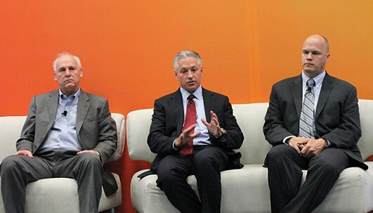 圖:從左至右依次為Dave Ramm(BrightSource董事長(zhǎng)兼首席執(zhí)行官)、Kevin Smith(SolarReserve首席執(zhí)行官)、Fred Redell(Abengoa美國(guó)公司總經(jīng)理)