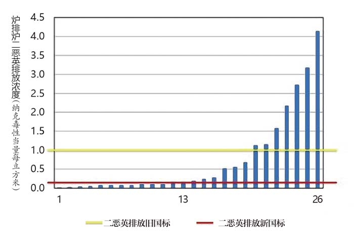 【說明】國內(nèi)26家垃圾焚燒企業(yè)二惡英排放測(cè)定均值,按舊國標(biāo)(1.0ng-TEQ/m3)的達(dá)標(biāo)率為78%;按新國標(biāo)(0.1ng-TEQ/m3)的達(dá)標(biāo)率為43%。其中,ng-TEQ/m3意為納克毒性當(dāng)量每立方米,納克是10億分之一克。