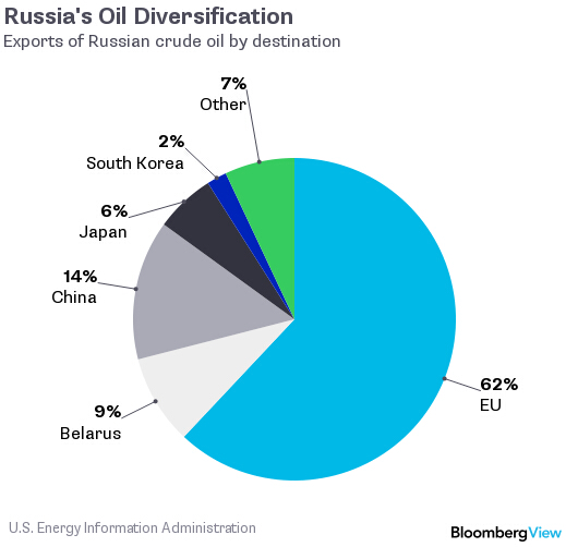 克里姆林宮和俄羅斯的石油公司長期以來已經(jīng)感知到歐洲正在試圖實現(xiàn)其能源供應(yīng)的多元化。俄羅斯也在尋找新的市場。到2000年時,俄羅斯幾乎所有的石油出口都是去往歐洲。但是在去年,這一比例下降至不足三分之二。