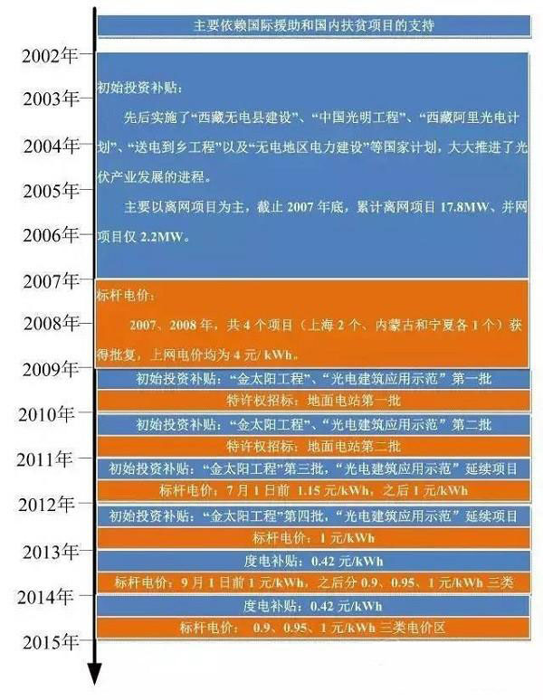 先用一張圖來(lái)說(shuō)明一下,我國(guó)對(duì)光伏產(chǎn)業(yè)的補(bǔ)貼歷程。