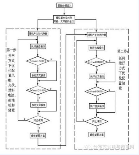 本發(fā)明公開了一種微電網(wǎng)電源的優(yōu)化規(guī)劃及評估方法,在并網(wǎng)和孤島兩種運行方式下,分別建立了微電網(wǎng)內(nèi)分布式電源優(yōu)化規(guī)劃的數(shù)學(xué)模型,考慮了柴油發(fā)電機(jī)啟動和運行的約束條件,獲得科學(xué)的風(fēng)電、光伏、燃料電池、柴油發(fā)電機(jī)和儲能的容量的優(yōu)化配置,采用遺傳和粒子群算法對微電網(wǎng)內(nèi)部的電源進(jìn)行了優(yōu)化規(guī)劃;并建立了包含穩(wěn)定電源占比、總投資、儲能的時移電量、電源容量充裕度、柴油發(fā)電機(jī)最長運行時間的規(guī)劃方案評估方法,保證了規(guī)劃方法的正確性和規(guī)劃結(jié)果的合理性。