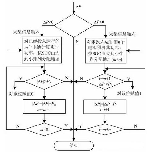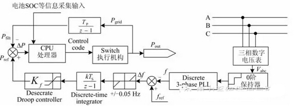 該系統(tǒng)詳細的控制流程圖如圖3所示。該系統(tǒng)采用數(shù)字離散控制,首先由數(shù)字電壓表采集到離散的母線電壓信號Vabc,然后由0階保持器對采集信號進行保持,由離散三相鎖相環(huán)提取出系統(tǒng)的頻率信號f,將系統(tǒng)頻率和參考頻率fref對比得到頻率偏差Δf,由設(shè)置的死區(qū)環(huán)節(jié)對頻率偏差進行判斷微網(wǎng)擾動是否屬于微小擾動,如果不是則將信號傳遞給Droop控制器處理,由Droop控制器的Droop特性控制電動汽車充電站電池的負荷容量。將該負荷容量作為功率參考信號Pref輸入系統(tǒng)的CPU處理器,由CPU處理器根據(jù)各電池的狀態(tài)參數(shù)(包括電池荷電狀態(tài)SOC、電池衰老系數(shù)、電池順序編號、環(huán)境溫度等)計算出一組二進制開關(guān)控制信號,通過開關(guān)信號的高低電平來控制執(zhí)行機構(gòu)對充電電池進行投切。CPU邏輯控制如圖4所示。對已經(jīng)投入運行的蓄電池,采用“恒流—限壓—浮充”三階段充電控制策略,該控制策略可以比較理想地接近蓄電池可接受的最佳充電電流曲線。同時考慮到電池的非線性特性,在不同階段的充電狀態(tài)下其吸收功率不一樣,將系統(tǒng)的輸出功率作為內(nèi)環(huán)反饋信號反饋給CPU進行功率差值控制。同時,電動汽車充電站的分布式電源特性依然不容忽視,其可以在微電網(wǎng)出現(xiàn)較大故障時,提供備用電源支撐。關(guān)于這些內(nèi)容的研究已相當(dāng)多,本文不作分析。對由于頻率回落退出充電的蓄電池,則用浮充方式以平衡電池自放電,待前面電池完成充電后繼續(xù)充電。