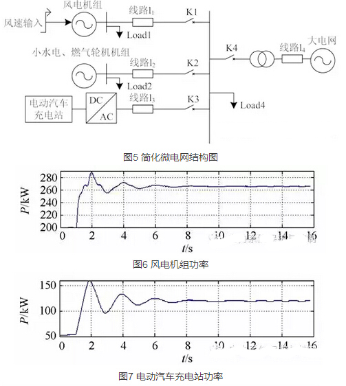 在Matlab/Simulink平臺搭建的簡化微網(wǎng)結(jié)構(gòu)圖如圖5所示。為簡化分析,文中只采用了風(fēng)力發(fā)電機作為間歇性波動功率的輸出電源。對小型水電機組、燃氣輪機機組等可控電源等效用同步發(fā)電機代替。在微網(wǎng)孤島運行時,開關(guān)K4斷開。風(fēng)力發(fā)電機組容量為300kW,小水電、燃氣輪機機組容量為600kW,間歇性電源的穿透率為33.3%,符合未來微網(wǎng)間歇性可再生電源高穿透率的趨勢。微網(wǎng)中負荷總?cè)萘繛?00kW,電動汽車充電站的初始運行功率為50kW,單臺電池在恒電流充電初期功率為1kW。用一個階躍信號模擬沖擊最大的陣風(fēng)輸入。在1s時風(fēng)速由10m/s階躍為11m/s。仿真結(jié)果如圖6~圖8所示。