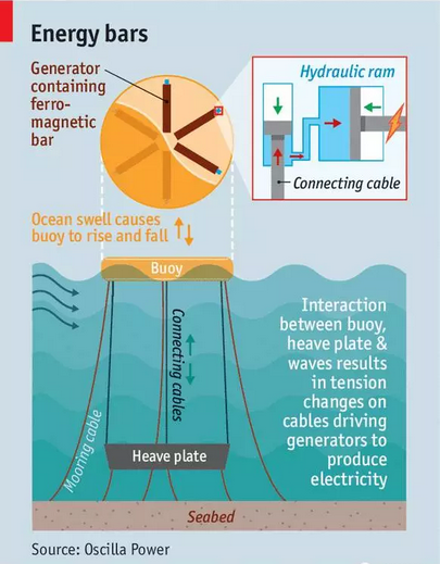 從海浪提取能源來發(fā)電是一個很誘人的創(chuàng)意。早在1974年,有人就進行了首次嘗試,愛丁堡大學員工斯蒂芬˙索爾特(StephenSalter)就想出了一個名為“鴨子”的創(chuàng)意:將房子大小的浮標系在海床上,利用浮標將海浪上漲的能量轉變成旋轉運動,從而驅動發(fā)電機。這項嘗試失敗了,因為要驅動發(fā)電機,還要進行大量的后期工作。但利用海浪能源發(fā)電的創(chuàng)意卻沒有因此消失;最近,設在西雅圖的振蕩電力公司(OscillaPower)進行了一次嘗試,試圖找到之前失敗的原因。