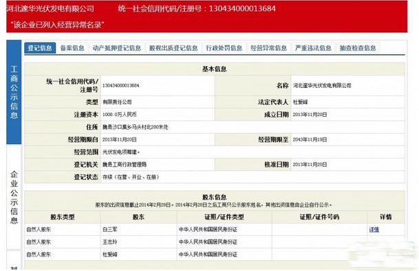杜愛峰作為法人的河北邃華光伏發(fā)電有限公司注冊資金1000萬,擬定投資6.5億建設(shè)光伏發(fā)電項目。據(jù)公司業(yè)務(wù)人員稱由于沒有資金,項目只是圈了地,至今未開工。