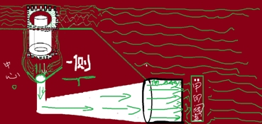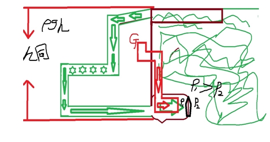 可是這個(gè)外力從何而來(lái)呢?請(qǐng)看上圖外力打擊型動(dòng)力模式。我們不難發(fā)現(xiàn),所謂外力,這里是一個(gè)巨大的重物,其重量與打擊力度正好相配,并且與密閉容器內(nèi)的活塞成為了一體(注意:重物與上活塞成為一體非常重要,或者本身就是一體,或者將兩者捆綁為一體)。重物的上端用鋼索懸掛在起重機(jī)的動(dòng)滑輪吊索上,平時(shí)待命的時(shí)候,起重機(jī)施加一個(gè)向上的提升力,重物便被高高懸掛起來(lái)。重物和活塞的底下是壓縮氣體,都被封鎖在密閉容器內(nèi)。如圖。上活塞一放一拉,下位水庫(kù)的氣囊就會(huì)一擴(kuò)一縮,從而帶動(dòng)整個(gè)系統(tǒng)工作,整個(gè)排水工作就有條不紊地進(jìn)行了。