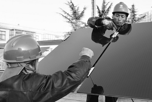 12月2日,安裝技術人員正在固定光伏板。