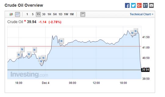 消息傳出后,油價(jià)大幅跳水,由此前漲超1%轉(zhuǎn)為跌近3%,WTI油價(jià)跌破40美元;ICE布倫特原油期貨跌幅超過2%,刷新日低至42.69美元/桶。