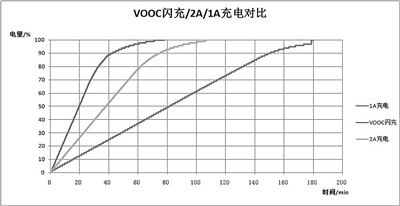 技術(shù)人員在適配器中加入了一顆MCU智能芯片,實現(xiàn)了突破性的開電壓環(huán)、分段恒流技術(shù),再加上MCU對電流的精準調(diào)節(jié),可以實現(xiàn)在開始充電時,VOOC“掛上高速擋”快速充電,充到一定程度時,又會自動跳到中速擋。這樣一來,VOOC閃充相比傳統(tǒng)充電速度提高4倍之多。“30分鐘可以充到3000mAh電池的75%”就是“充電5分鐘,通話兩小時”的原因。