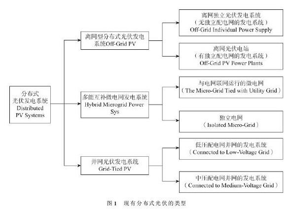 (1)根據(jù)并網(wǎng)特性與運行方式的不同,可分為并網(wǎng)光伏發(fā)電系統(tǒng)、離網(wǎng)型分布式光伏發(fā)電系統(tǒng)、多能互補微電網(wǎng)發(fā)電系統(tǒng)(見圖1)。