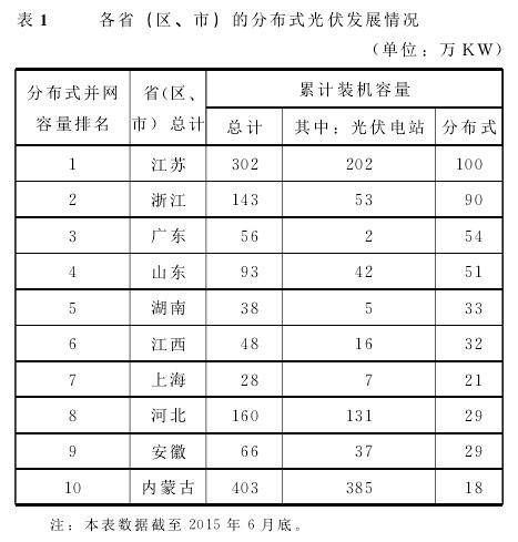 從國際發(fā)展水平看,中國由于電網(wǎng)特點與開發(fā)條件,分布式光伏處在探索與發(fā)展階段,與全球發(fā)達國家相比仍存在差距。目前,發(fā)展較快的省份主要集中在中、東部地區(qū),排名前五位的省份是江蘇(100萬KW)、浙江(90萬KW)、廣東(54萬KW)、山東(51萬KW)和湖南(33萬KW)。中國的分布式光伏發(fā)展以“金太陽”工程和工業(yè)園區(qū)項目為主,住宅項目也在逐漸興起。各省份的分布式光伏的發(fā)展情況如表1所示。