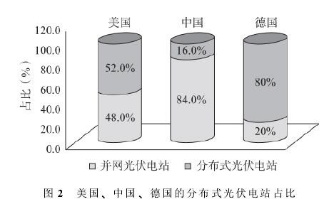 截至2014年年底,全球光伏電站裝機容量為1.89億KW,同比增長35.9%,全年光伏新增裝機容量為4700萬KW,同比增長21.7%,其中一半以上是分布式光伏電站。截至2014年年底,美國的光伏發(fā)電裝機容量為1202萬KW,其中分布式光伏電站并網(wǎng)裝機容量為625萬KW,占比約52%;德國光伏電站裝機容量為3590萬KW,其中分布式電站裝機容量為2800萬KW,占比約80%(見圖2)。