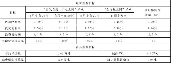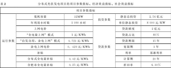 項目所在工業(yè)園區(qū)成立了園區(qū)分布式光伏示范項目的開發(fā)協(xié)調(diào)機構(gòu)(園區(qū)管委會),負責協(xié)調(diào)發(fā)電企業(yè)與園區(qū)用能企業(yè)簽訂屋頂協(xié)議與合同能源管理協(xié)議,與園區(qū)所屬電網(wǎng)公司簽訂余電上網(wǎng)收購協(xié)議。在此模式下,業(yè)主獲得電費與補貼收入,用電企業(yè)享受優(yōu)惠電價與節(jié)能效益,園區(qū)管委會負責協(xié)調(diào)屋頂與并網(wǎng)接洽并收取少量手續(xù)費,促進協(xié)議的簽訂和項目的正常運營,實現(xiàn)了多方共贏。本項目業(yè)主方集開發(fā)商、設(shè)備供應(yīng)商、EPC承包商為一體,有利于發(fā)揮組織與協(xié)調(diào)優(yōu)勢,減少商業(yè)與操作風險,在簡化商業(yè)模式的同時,促進光伏電池組件、逆變器等設(shè)備的消納,形成多方互惠共贏的商業(yè)化運作模式。表2列出了分布式光伏發(fā)電項目的項目參數(shù)指標、經(jīng)濟效益指標和社會效益指標。