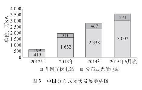 目前,全國28個有分布式光伏發(fā)電項目的省份中,浙江、湖南、廣東等地區(qū)的分布式光伏發(fā)電占比較高。此外,中國分布式光伏發(fā)電裝機容量超過100MW的省份超過10個,成為世界分布式光伏領(lǐng)域的重要市場。截至2015年6月底,光伏電站裝機容量達3578萬KW,其中分布式光伏電站裝機容量達571萬KW,占比16.0%,近年來中國分布式光伏的發(fā)展情況見圖3。