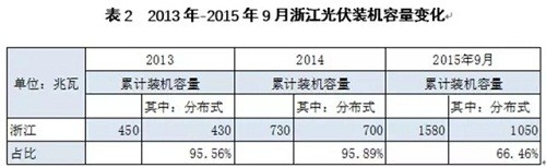 在國家能源局的大力推動和省政府的高度重視下,全省光伏發(fā)電應(yīng)用態(tài)勢良好,光伏產(chǎn)業(yè)逐步回暖。就全國的太陽能資源分布情況來看,東南沿海地區(qū)資源較差,但是經(jīng)濟發(fā)達、用電負荷高不會產(chǎn)生限電,售電電價高可以彌補資源差的效益損失,因此是投資分布式光伏發(fā)電的理想地區(qū)。截止2015年9月,浙江省累計光伏裝機達1580MW,其中分布式光伏裝機達1050MW(詳見表2)。