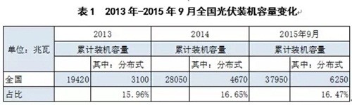 在裝機容量上,把“十二五”期間光伏裝機量目標從2100萬千瓦上調(diào)到3500萬千瓦。由于政策刺激,2013年至2015年全國光伏裝機增速較快,截止2015年9月(表1),全國累計光伏裝機37950MW,其中分布式光伏裝機達6250MW。
