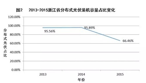 2013年到2015年9月,全國范圍內(nèi)無論是總的光伏發(fā)電裝機容量還是分布式光伏發(fā)電,都呈一個平穩(wěn)發(fā)展的趨勢。2013年底,浙江省光伏發(fā)電裝機容量450MW,較2012年增長3.5倍,90%以上為分布式。2014年,全省新增280MW光伏發(fā)電裝機容量,其中90%為分布式,分布式占比達到峰值,占近96%。