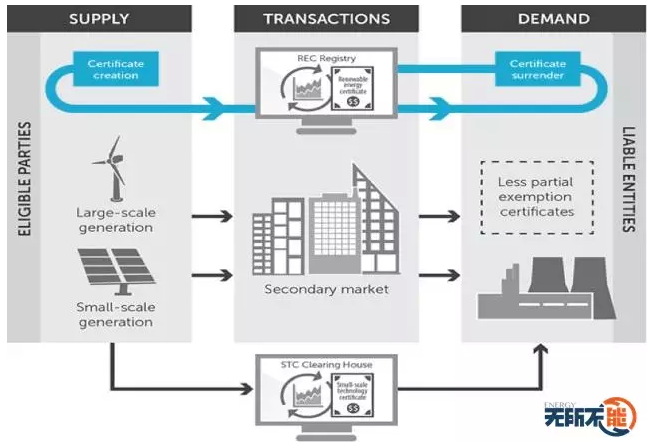 澳大利亞是世界上最早在全國(guó)范圍內(nèi)實(shí)行可再生能源配額制的國(guó)家。2000年,澳大利亞政府通過(guò)《可再生能源法案》,發(fā)布強(qiáng)制性可再生能源目標(biāo),對(duì)相關(guān)電力批發(fā)商規(guī)定了購(gòu)買(mǎi)一定比例可再生能源電力的法定義務(wù)。2001年4月1日,澳大利亞可再生能源證書(shū)系統(tǒng)在全國(guó)范圍內(nèi)正式運(yùn)行。從2011年1月1日開(kāi)始,澳大利亞將可再生能源證書(shū)分為大規(guī)模證書(shū)(LGCs)和小規(guī)模證書(shū)(SGCs)兩種類(lèi)型,其中大規(guī)模RECs主要面向發(fā)電站,小規(guī)模RECs主要面向太陽(yáng)能熱水器、空氣源熱躉熱水器和小型發(fā)電機(jī)組。