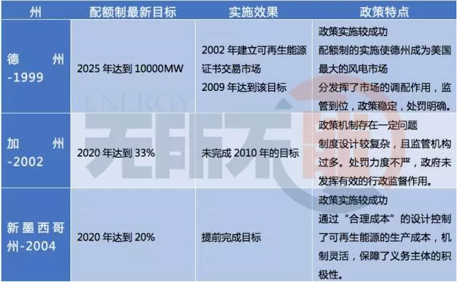其中,德克薩斯州、加利福尼亞州和新墨西哥州為美國(guó)實(shí)施可再生能源配額制比較典型的幾個(gè)地區(qū),其實(shí)施效果對(duì)比如下。