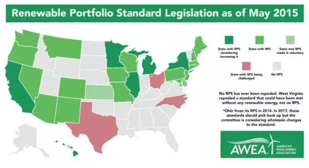美國(guó)是第一個(gè)實(shí)行可再生能源配額制的國(guó)家,也是實(shí)行可再生能源配額制較為成功的一個(gè)國(guó)家。截至2015年5月,已有30多個(gè)州依據(jù)本州資源、市場(chǎng)、政策背景制定并實(shí)施了可再生能源配額制,實(shí)施RPS的州和地區(qū)分布如下圖。據(jù)憂思科學(xué)家聯(lián)盟預(yù)測(cè),到2025年,可再生能源配額制將促使美國(guó)的可再生能源電力增加76750MW,配額制對(duì)可再生能源發(fā)展的促進(jìn)功能由此可見(jiàn)一斑。