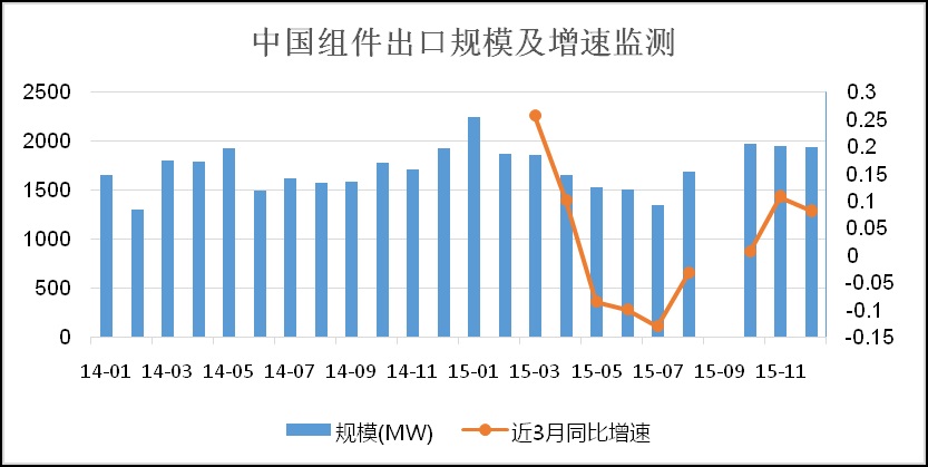 2015年第4季度中國(guó)光伏組件出口相比第3季度有較大提升,特別是11月、12月出口規(guī)模與去年同期相比均為正增長(zhǎng)。第4季度,中國(guó)組件合計(jì)出口5.9GW,同比增長(zhǎng)約8%。事實(shí)上,從8月開始情況便已經(jīng)出現(xiàn)好轉(zhuǎn)。