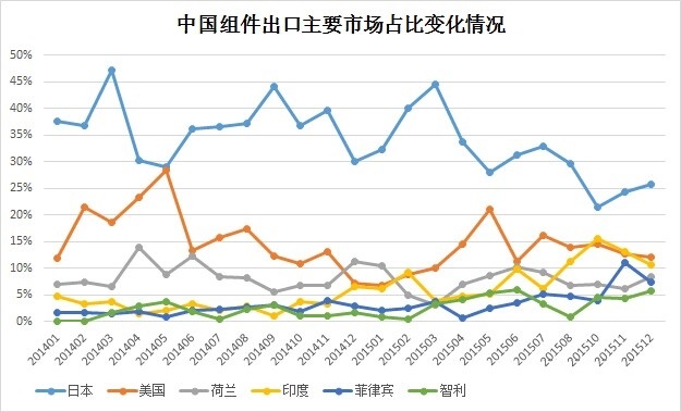 日本一直是中國(guó)組件出口的最大目的國(guó)市場(chǎng),也是世界上最大的光伏應(yīng)用市場(chǎng)之一。2015年第1季度,日本占中國(guó)組件出口份額為41%。此后整體呈下跌趨勢(shì)。到第4季度日本的份額已降至24%。日本份額的下降主要由于日本光伏市場(chǎng)增長(zhǎng)的放緩。2015年4月后日本的FIT收購(gòu)價(jià)格大幅下降,而組件成本的自然下降又不足以彌補(bǔ)IRR的降低,從而抑制了裝機(jī)量的增長(zhǎng)。