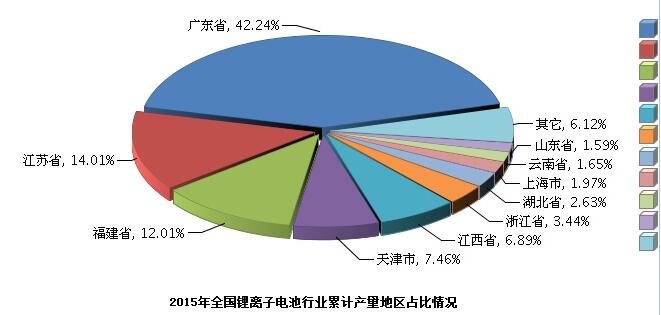 根據(jù)國(guó)家統(tǒng)計(jì)局公布數(shù)據(jù),2015年全國(guó)鋰電池行業(yè)累計(jì)完成產(chǎn)量同比增長(zhǎng)3.04%。產(chǎn)量主要集中在廣東、江蘇、福建、天津、江西、浙江、湖北、上海、云南、山東地區(qū),10個(gè)地區(qū)完成鋰電池產(chǎn)量占全國(guó)的93.88%。2015年全國(guó)鋰電池行業(yè)產(chǎn)量地區(qū)占比情況如下圖所示。