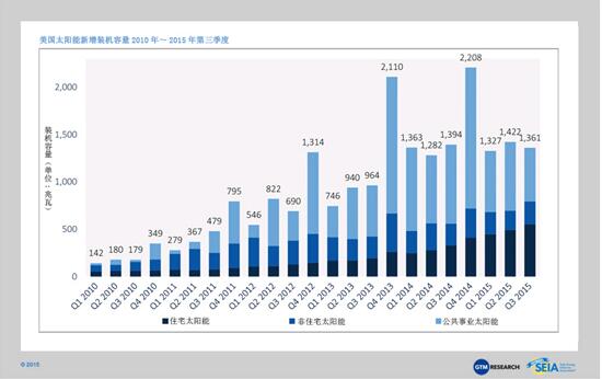 美國太陽能市場保持著破紀(jì)錄的發(fā)展勢頭,在2015年第三季度中新增裝機容量為1361兆瓦,在2015年太陽能市場前三個季度中提升了4.1吉瓦。得益于住宅太陽能市場的快速發(fā)展,2015年第三季度成為美國太陽能裝機容量連續(xù)增長的第八個季度,太陽能裝機容量增加超過1吉瓦。