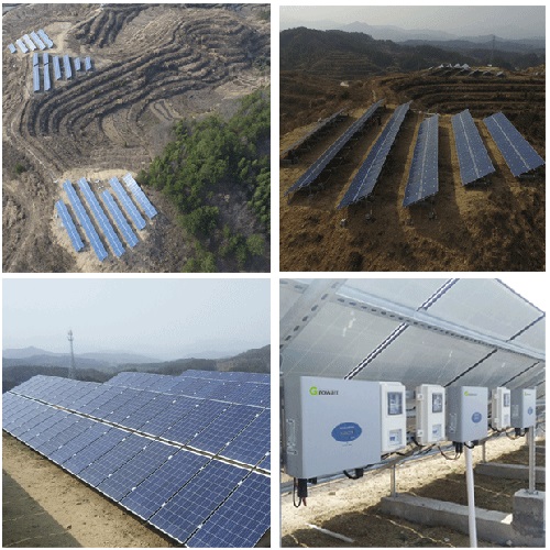 我們第二站的目的地位于金寨縣果子園鄉(xiāng)的某座山中,和之前的戶用屋頂電站不同,這里是利用山中空地建設(shè)的100KW以上的村級電站,電站的售電收入會(huì)由村委按照一定的標(biāo)準(zhǔn)發(fā)放到貧困戶手中。由于項(xiàng)目地點(diǎn)位于山中,路途稍顯崎嶇,行駛在彎彎的山路上,坐在汽車?yán)锩嬉膊⒉惠p松,到了半山腰之后,遠(yuǎn)遠(yuǎn)就能看到太陽能電池板整齊地排列著,如同為荒坡披上了一層藍(lán)色的“盔甲”,在陽光的照耀下,閃閃發(fā)光,給原本荒蕪的山中添加了一份生氣。在村代表的陪同下,古瑞瓦特工作人員檢查了所有逆變器的工作情況,幾十臺機(jī)器運(yùn)行正常,正源源不斷地給村里貢獻(xiàn)著收益。“以前這里就是一座荒山,現(xiàn)在能給村民生財(cái)了,就像是一座寶山。”村代表愉快地和我們分享了村里安裝了光伏電站之后所帶來的變化,并感謝古瑞瓦特工作人員的到來,幫助他們更好地了解了日常的電站維護(hù)常識。
