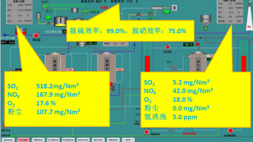 試運(yùn)行期間,該裝置保持了良好的性能指標(biāo),脫硫效率達(dá)到99%,脫硝效率達(dá)到75%,粉塵排放值達(dá)到10mg/Nm3以下,各項(xiàng)指標(biāo)基本達(dá)到“超低排放”標(biāo)準(zhǔn)。