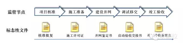 我國電力工程建設(shè)分為:建設(shè)登記、施工準(zhǔn)備、建設(shè)并網(wǎng)、調(diào)試移交和竣工驗(yàn)收等五個(gè)階段,這五個(gè)階段的標(biāo)志性文件分別為:核準(zhǔn)批復(fù)(完成備案)、施工許可證、機(jī)組并網(wǎng)鑒定書、啟動(dòng)驗(yàn)收交接書、竣工驗(yàn)收備案表,見下圖。