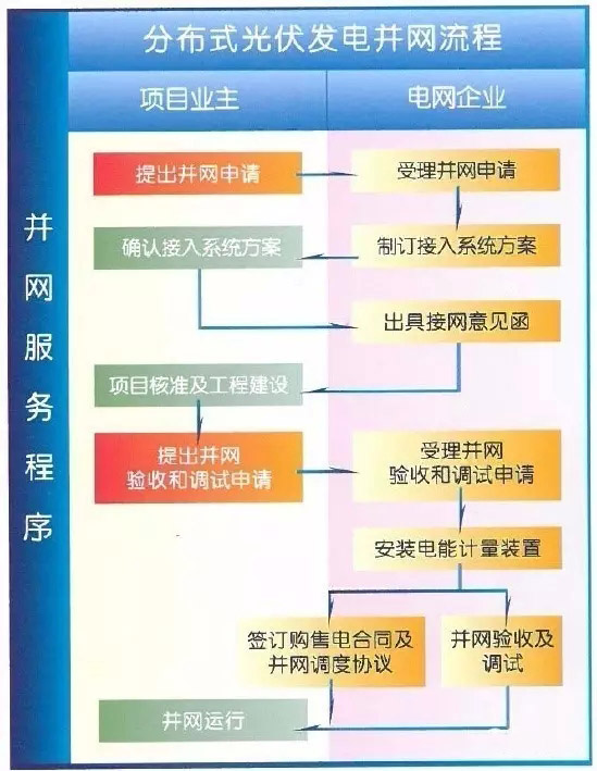 根據(jù)財(cái)政部《關(guān)于分布式光伏發(fā)電實(shí)行按照電量補(bǔ)貼政策等有關(guān)問題的通知》:“申請補(bǔ)貼的分布式光伏發(fā)電項(xiàng)目必須符合以下條件:1.按照程序完成備案。2.項(xiàng)目建成投產(chǎn),符合并網(wǎng)相關(guān)條件,并完成并網(wǎng)驗(yàn)收等電網(wǎng)接入工作。符合上述條件的項(xiàng)目可向所在地電網(wǎng)企業(yè)提出申請,經(jīng)同級財(cái)政、價(jià)格、能源主管部門審核后逐級上報(bào)。”由于電網(wǎng)企業(yè)承擔(dān)著轉(zhuǎn)付國家財(cái)政補(bǔ)貼的功能,因此,電網(wǎng)企業(yè)的并網(wǎng)調(diào)試和驗(yàn)收很關(guān)鍵。根據(jù)國家能源局《分布式光伏發(fā)電項(xiàng)目管理暫行辦法》,分布式光伏在正式建設(shè)前,應(yīng)向當(dāng)?shù)乜h級電網(wǎng)企業(yè)提出并網(wǎng)接入申請(電網(wǎng)企業(yè)應(yīng)在20個(gè)工作日內(nèi)出具并網(wǎng)接入意見,對于集中多點(diǎn)接入的分布式光伏發(fā)電項(xiàng)目可延長到30個(gè)工作日),“分布式光伏項(xiàng)目本體工程建成后,向電網(wǎng)企業(yè)提出并網(wǎng)調(diào)試和驗(yàn)收申請,電網(wǎng)企業(yè)指導(dǎo)和配合項(xiàng)目單位開展并網(wǎng)運(yùn)行調(diào)試和驗(yàn)收,電網(wǎng)企業(yè)應(yīng)根據(jù)國家有關(guān)標(biāo)準(zhǔn)制定分布式光伏發(fā)電電網(wǎng)接入和并網(wǎng)運(yùn)行驗(yàn)收辦法”(對于35kV及以下接入的,這里的電網(wǎng)企業(yè)指的是地市級或縣級電網(wǎng)企業(yè))。
