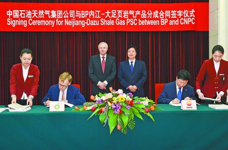 圖為中國石油天然氣集團公司與BP內(nèi)江—大足頁巖氣產(chǎn)品分成合同簽字儀式現(xiàn)場。