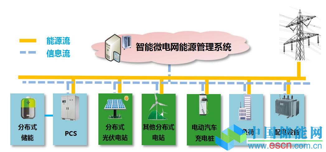 通常來說,微電網(wǎng)的一般結(jié)構(gòu)如下圖所示,由能源流和信息流相互融合而成,分為分布式能源、儲能裝置、電能變換裝置、保護裝置和微電網(wǎng)能源管理系統(tǒng)組成,也可根據(jù)實際應(yīng)用情況進行增減。相對于大電網(wǎng),微電網(wǎng)表現(xiàn)為單一的受控單元,它可以保證用戶電能的質(zhì)量和供電安全,同時也是智能電網(wǎng)及能源互聯(lián)網(wǎng)的重要組成部分。