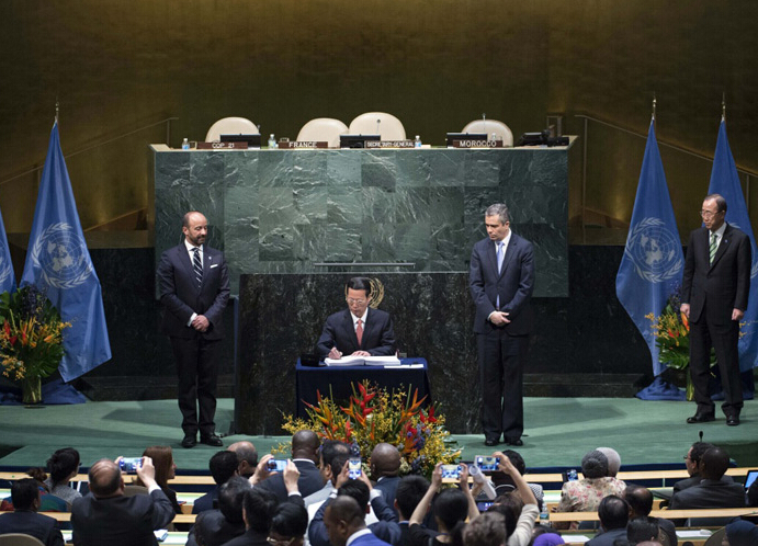 國家主席習(xí)近平特使、國務(wù)院副總理張高麗22日在紐約聯(lián)合國總部出席《巴黎協(xié)定》高級(jí)別簽署儀式,并代表中國簽署《巴黎協(xié)定》。張高麗在簽署儀式開幕式上發(fā)表題為《推進(jìn)落實(shí)〈巴黎協(xié)定〉共建人類美好家園》的講話。