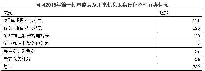 國網(wǎng)2016年第一批電能表及用電信息采集設(shè)備招標(biāo)活動(dòng)中,72家供應(yīng)商在五類設(shè)備招標(biāo)中共中標(biāo)332個(gè)包。五類物資及包數(shù)分別為:2級單相智能電能表111包、1級三相智能電能表125包、0.5S級三相智能電能表28包、0.2S級三相智能電能表7包、集中器/采集器37包、專變采集終端24包。