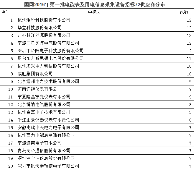 不知是出于巧合還是刻意安排,中標(biāo)最多的前5家供應(yīng)商中標(biāo)包數(shù)都是12包,分別是深圳市科陸電子科技股份有限公司、江蘇林洋能源股份有限公司、寧波三星醫(yī)療電氣股份有限公司、華立科技股份有限公司、杭州炬華科技股份有限公司。
