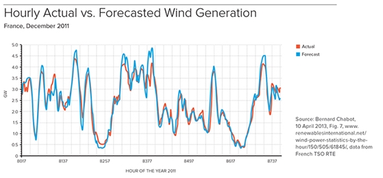 這種穩(wěn)定和可靠的電力供應(yīng)依靠的是對(duì)許多變量的籌劃調(diào)控,所以必須準(zhǔn)確預(yù)報(bào)電力輸出的變化。盡管準(zhǔn)確性還有待提高,但是預(yù)報(bào)能力的發(fā)展已經(jīng)實(shí)現(xiàn)了光伏發(fā)電和風(fēng)力發(fā)電比電力需求更容易預(yù)測(cè)。例如,在一個(gè)多暴風(fēng)雨的冬季月份,法國(guó)電網(wǎng)運(yùn)營(yíng)商報(bào)告的全國(guó)實(shí)際風(fēng)力發(fā)電量與其提前一天預(yù)報(bào)的發(fā)電量(見如下圖示)已十分接近。較少的誤差在電能實(shí)際調(diào)度上網(wǎng)前的幾個(gè)小時(shí)內(nèi)也消失了。