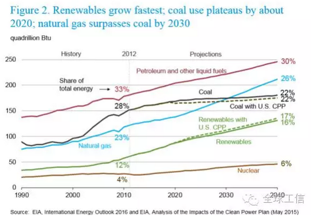 (可再生能源使用量增長迅速;大約到2020年,煤炭使用量會進(jìn)入平穩(wěn)期;到2030年,天然氣使用量會超過煤炭使用量)