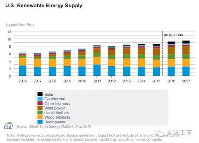 到2040年,煤炭、天然氣和可再生能源的發(fā)電量會大致相同(28%-29%),這會是一巨大變化。美國能源信息管理局(EIA)公布的2016年國際能源展望(International Energy Outlook2016)報告稱,煤炭現(xiàn)有發(fā)電量占到40%??稍偕茉词悄壳笆澜缟习l(fā)電貢獻(xiàn)增長率最快的能源,預(yù)計至2040年期間,以每年2.6%的速率增加。報告指出,水電和風(fēng)能是全球發(fā)電量增加的最大貢獻(xiàn)者。從2013年到2040年,水電和風(fēng)能占可再生能源發(fā)電量的2/3。