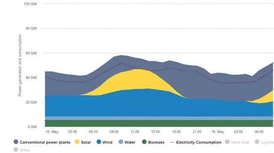 2016年5月15日當?shù)貢r間下午2點,據柏林的Agora電力研究機構監(jiān)測,太陽能及風能達到峰值,可再生能源供應電力達到45.5GW,與此同時整體電力需求為45.8GW。與此同時,電力價格在一些15分鐘的周期內出現(xiàn)了一定的回落,最低跌至50歐元(57美元)/MWh。