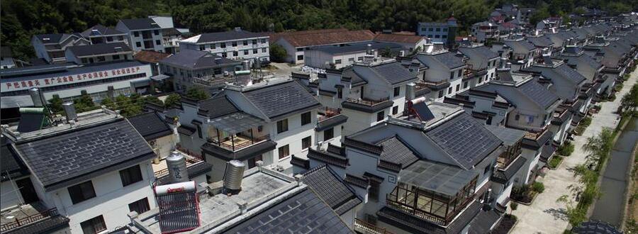 浙江建德:光伏瓦節(jié)能助脫貧浙江省建德市蓮花鎮(zhèn)戴家下山移民新村農(nóng)居的屋頂安裝的光伏瓦片(5月17日攝)。浙江建德市蓮花鎮(zhèn)戴家村下山移民新村光伏瓦發(fā)電項目于2013年11月正式投入使用以來,使用光伏瓦的農(nóng)居數(shù)量已達67戶,共計實現(xiàn)用戶節(jié)電15.2萬千瓦時。該新能源項目不僅環(huán)保節(jié)能,農(nóng)戶富余的電量還可以賣給國家電網(wǎng),成為下山移民扶貧脫貧新舉措。