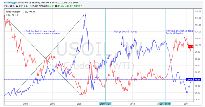 美元和各種商品呈現出負相關關系。下圖的圖表展示了在過去12年間油價與美元的變化關系。