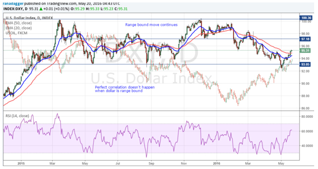 正如我們在下圖表中所看到的,自從美元走勢在93到100區(qū)間內波動的時候,國際油價的走勢主要受石油和經濟基本面的影響,而不是跟著美元的強弱而波動。