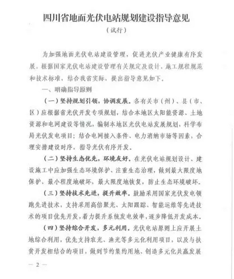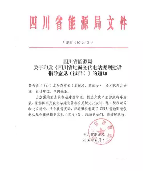 日前,四川省能源局下發(fā)《四川省地面光伏電站規(guī)劃建設(shè)指導(dǎo)意見(試行)》,對(duì)該省地面光伏電站建設(shè)從選址、設(shè)計(jì)到施工驗(yàn)收做了明確規(guī)定,全文如下: