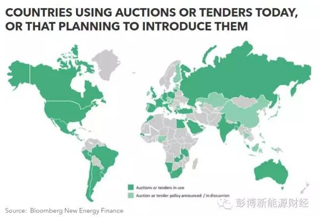 根據(jù)彭博新能源財經(jīng)的《新能源展望》,2040年前,目前已經(jīng)引入競拍或投標機制的國家每年將迎來25%到35%的新增清潔能源電力容量(小規(guī)模光伏機組除外);