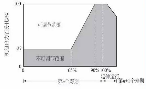 法國核電的建造始于20 世紀 50 年代,早期建設的核電站均為 GCR(氣冷堆)類型核電機組,不具備負荷調(diào)節(jié)能力。隨著法國核電所占比例不斷上升,到20世紀80年代電網(wǎng)調(diào)峰問題開始逐步顯現(xiàn),電網(wǎng)調(diào)峰日益困難,而受資源、地理條件等的限制,法國氣電、抽水蓄能電站的建設均受到了一定的制約。在此情況下,法國在80年代初開始研究對原有核電機組進行技術(shù)改造,到90年代初法國核電機組法國核電機組從設計角度,在燃料的前65%壽期內(nèi),最低可降出力至27%額定功率;在燃料前65%~90%壽期內(nèi),機組可調(diào)范圍呈線性減小趨勢,最小技術(shù)出力逐步增大;到90%~100%壽期和燃料延伸運行階段,機組已不具備調(diào)節(jié)能力,一個壽期內(nèi)機組調(diào)峰能力變化情況詳見下圖。