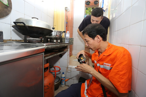 圖為喜威安全技術(shù)工程師免費上門為居民進行燃氣安全檢測